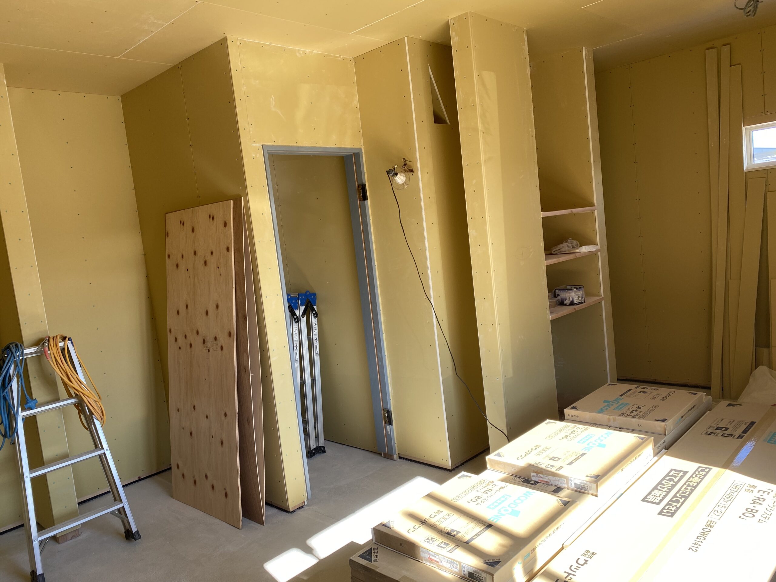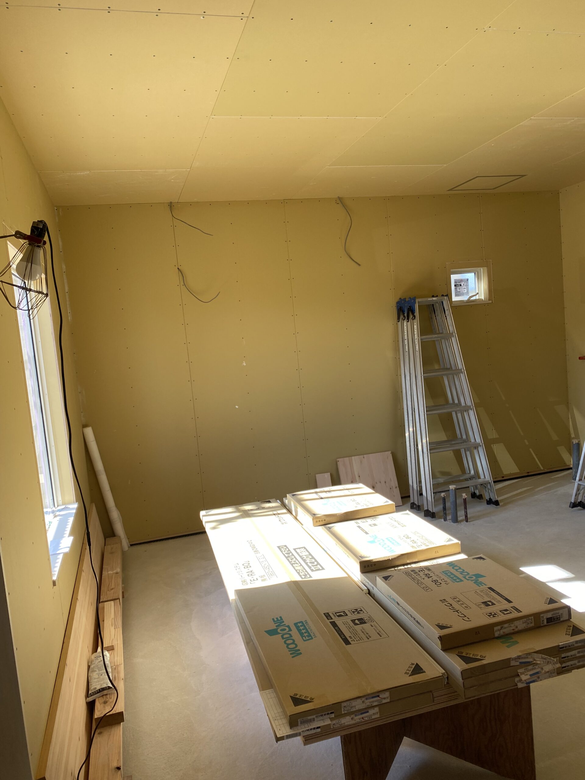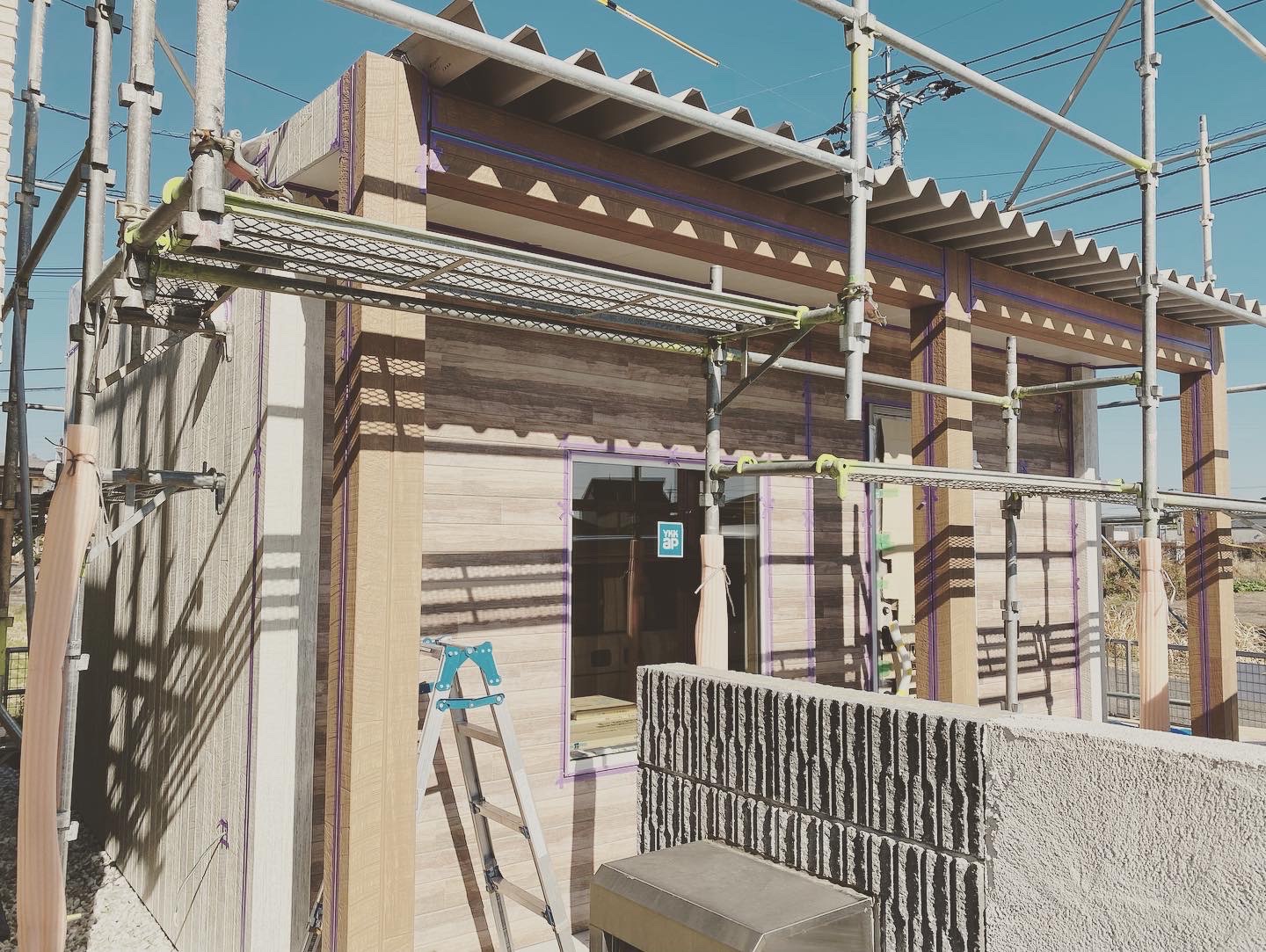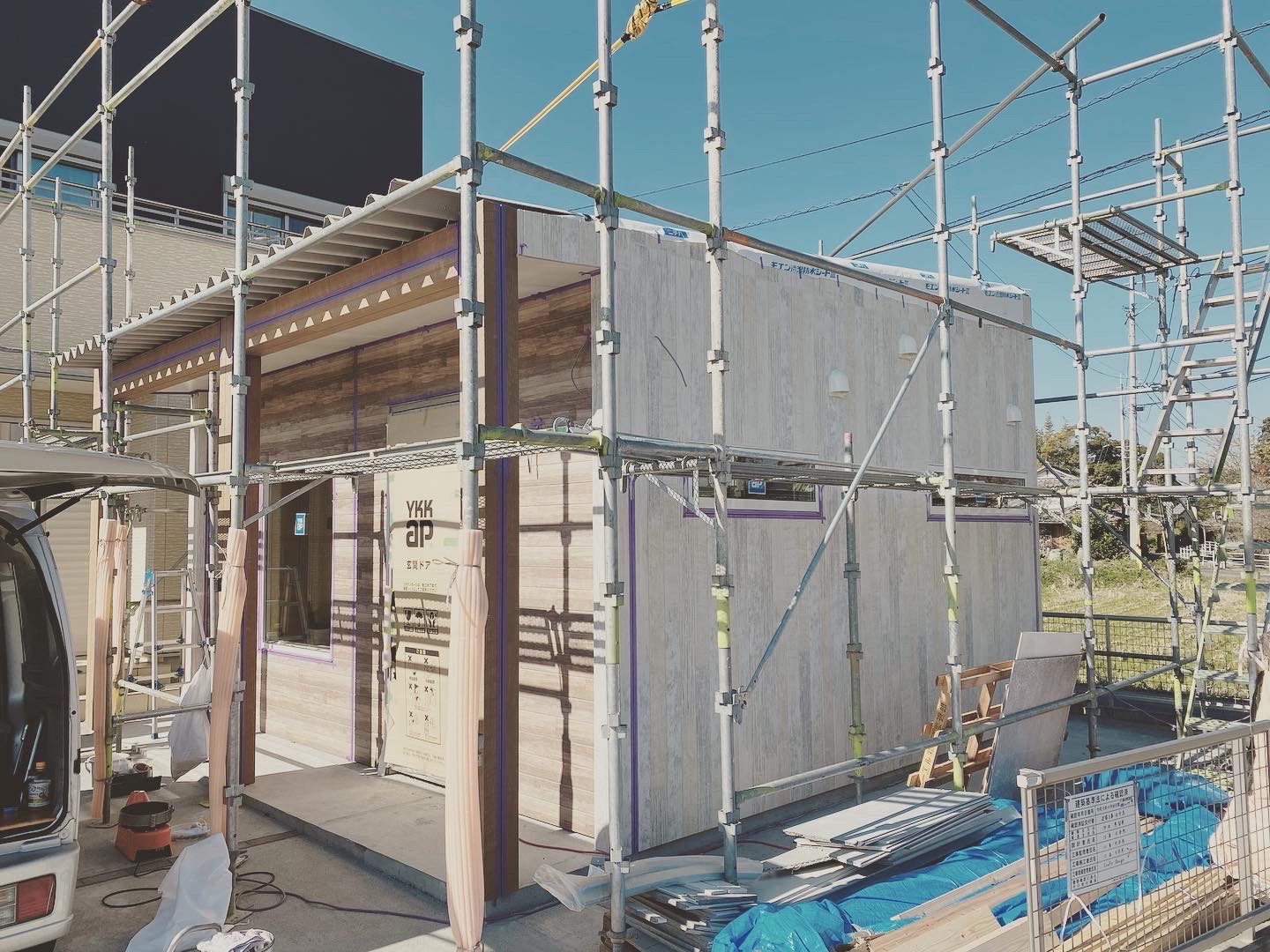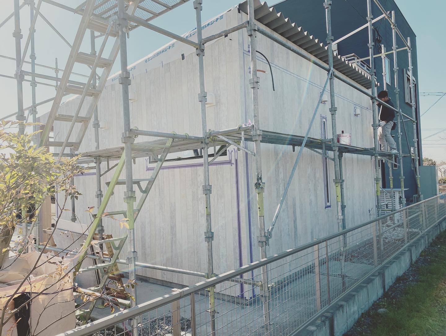 外壁工事が終わり、コーキング中です✂️💈素敵な感じ💡中は、大工工事ももうすぐ終わり、今日はクロス工事の打合せ👷♀️