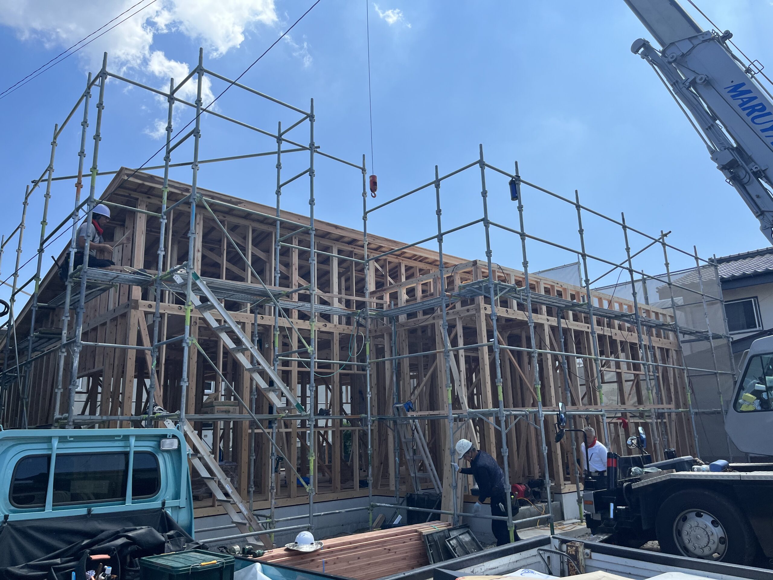 今日は一日雨も降らず晴れて風が少しあって涼しくも感じながら職人さん達の皆さんのおかげで15時に上棟式終わりました。暑い中ありがとうございました。
